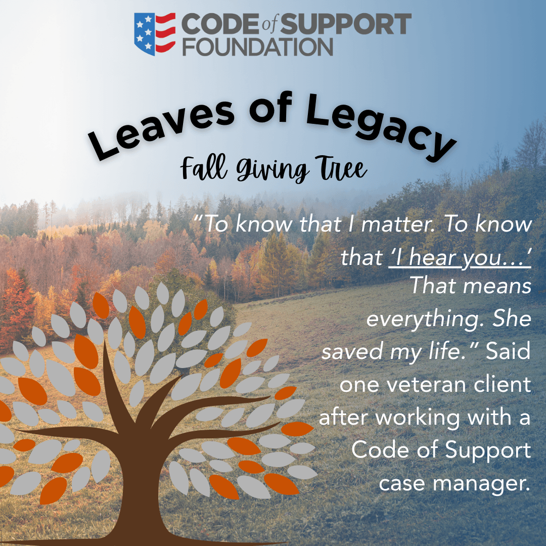 You can leaf a legacy by making your best gift this fall to provide service members, veterans, and caregivers with the best care from our Case Managers and Community Resource Navigators. When you do, we'll add a leaf to our fall giving tree. Let's come together to make this a season of support for our nation's heroes and their families!Â